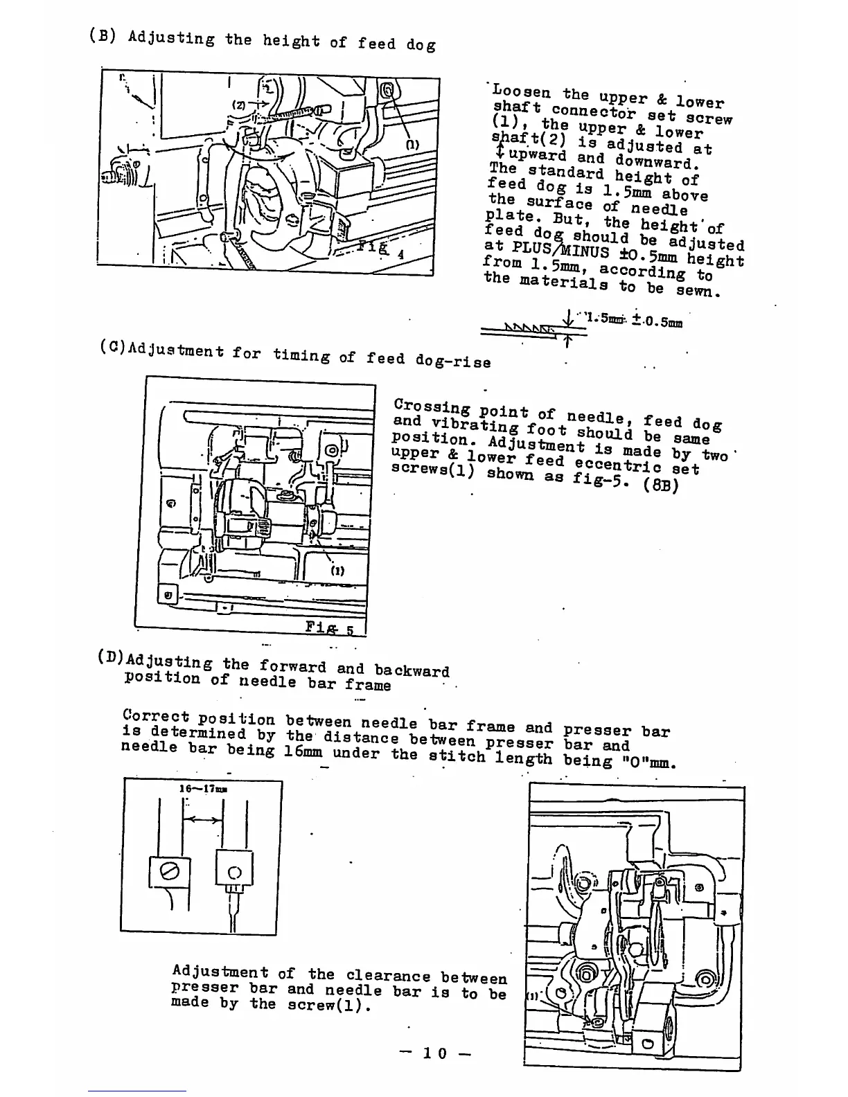 Seiko TH-8B - Adjusting the height of feed dog; Adjustment for timing of feed dog-rise; Adjusting the forward and backward position of needle bar frame