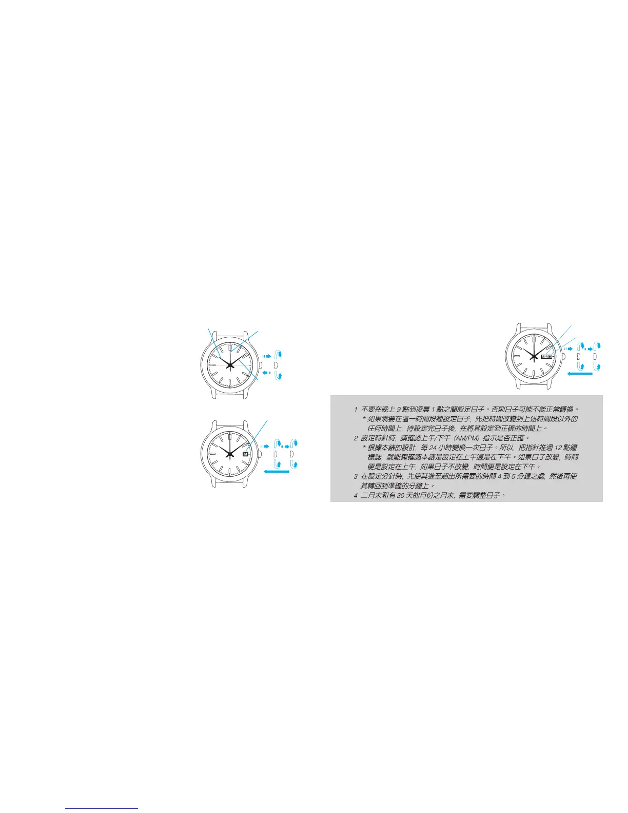 1.將錶冠拉出到第一格並設定前一天的星期和日
