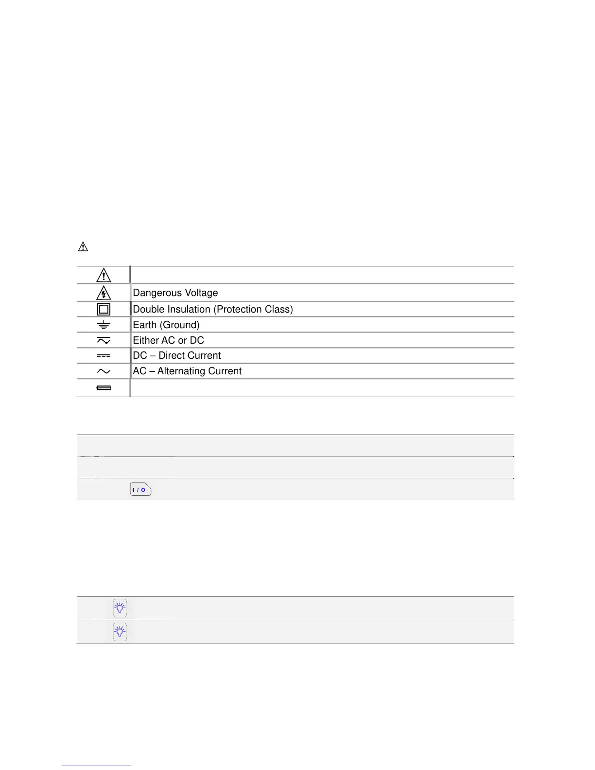 Symbols used on the test tool and in this manual are explained in the next table.