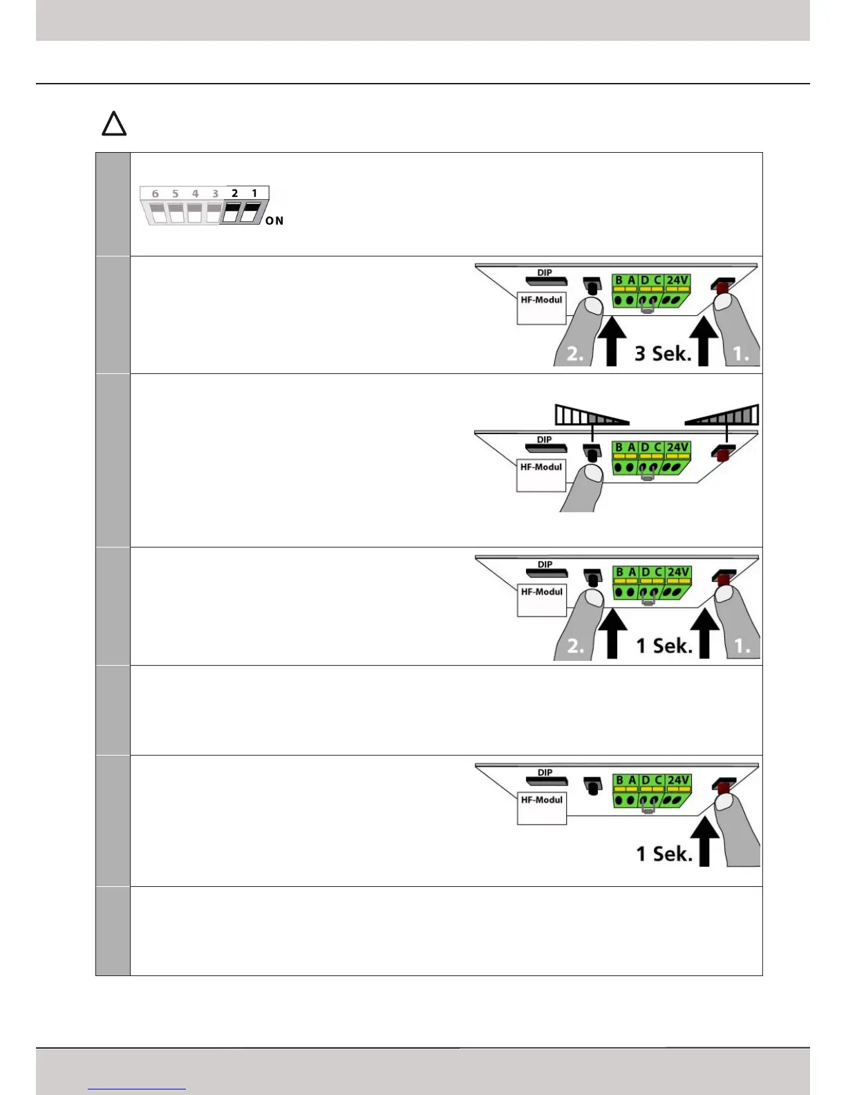 After changing the DIP-switch settings the red LED will start blinking in intervalls (2 blinks