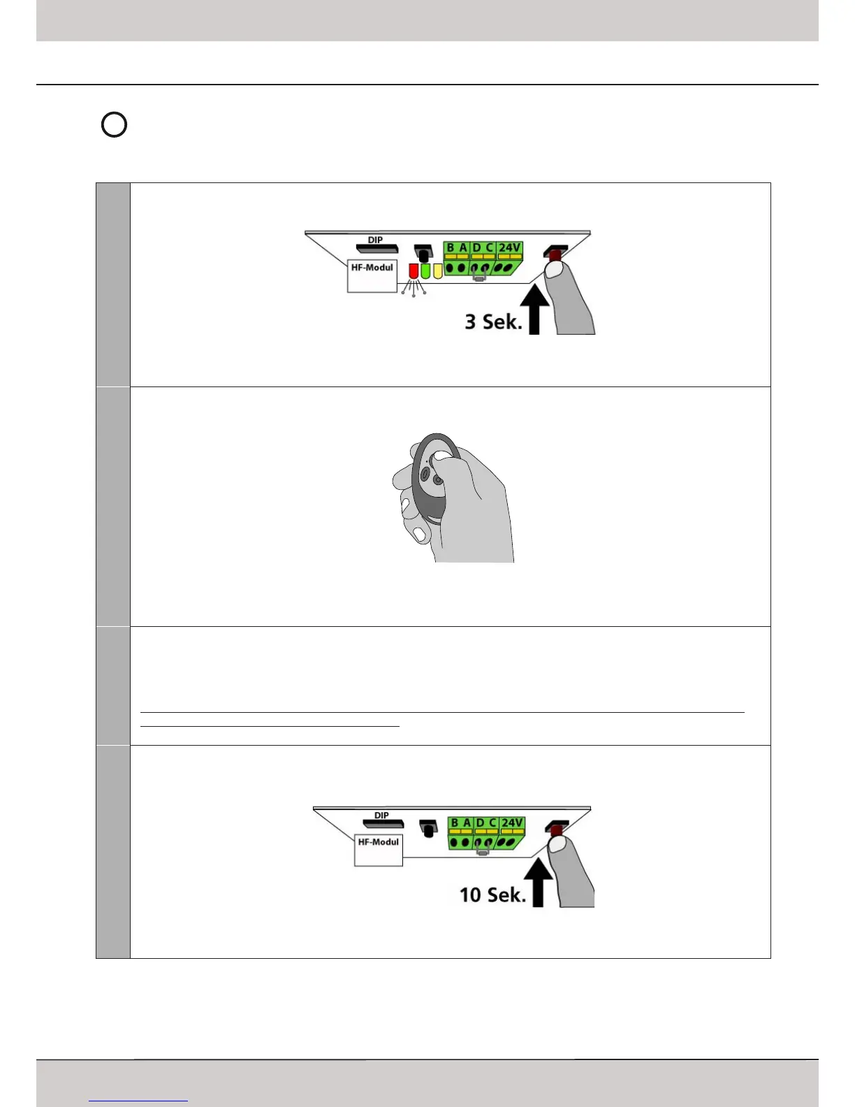 Keep the red LEARN-button pressed for 3 seconds� Release it once the red LED and the operators‘ lighting start blinking�