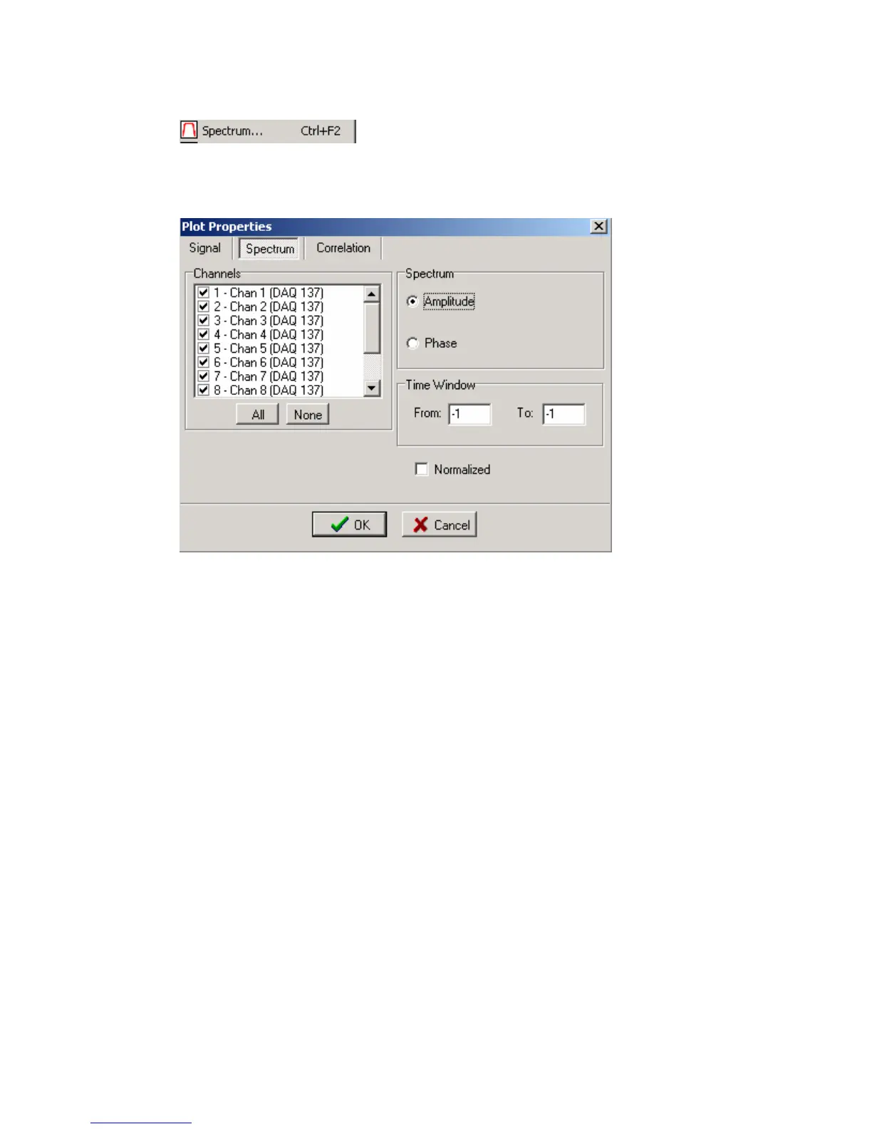 The time window allows performing a spectrum analysis on a time window. An entry of