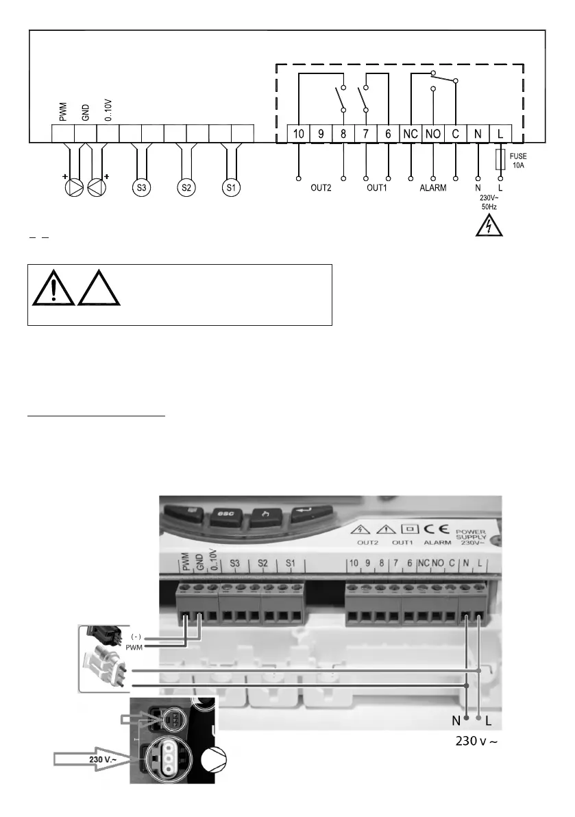 The outputs OUT1, OUT2 and Alarm, are voltage free. It is advisable to t a 10A 250V~ fuse on the power unit mains capable