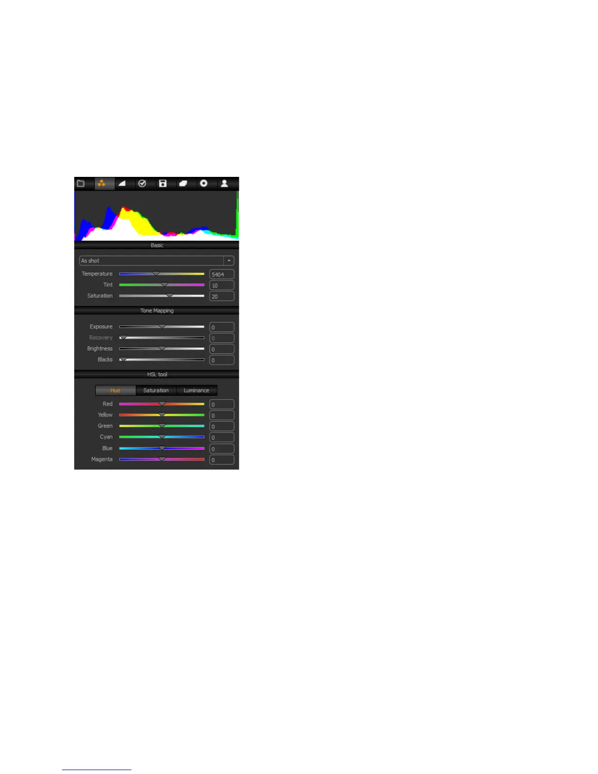all the basic colour adjustment parameters and some basic tone mapping tools: