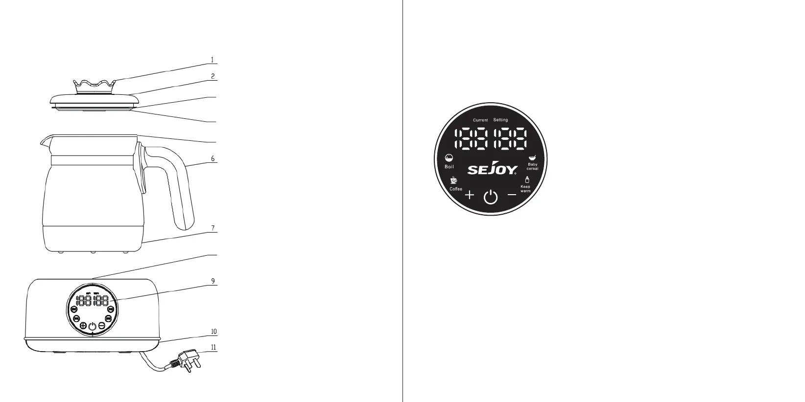 3. Increase and decrease keys: boil, coffee, baby cereal, and keep