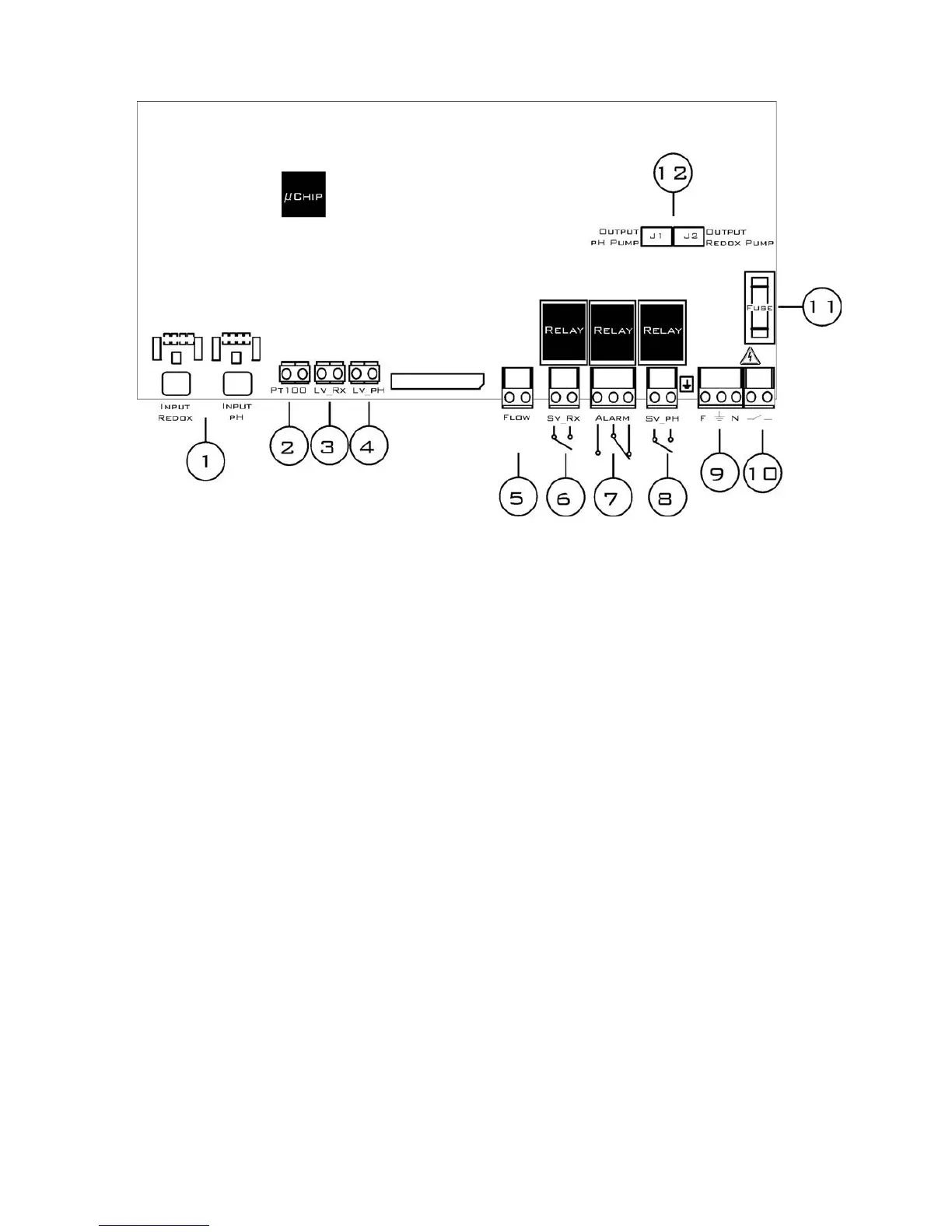 12) Sortie pompe pH (J1) et pompe Redox (J2)
