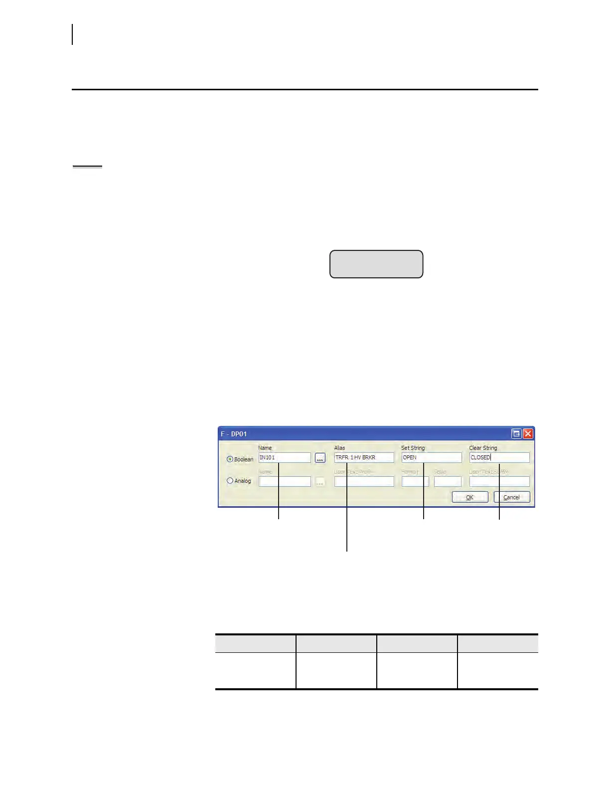 Device Word Bit Name, “Alias”, “Set String”, “Clear String”