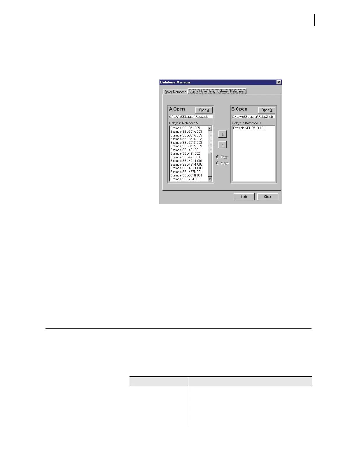 Highlight a relay setting in the A database, select Copy or Move, and click the