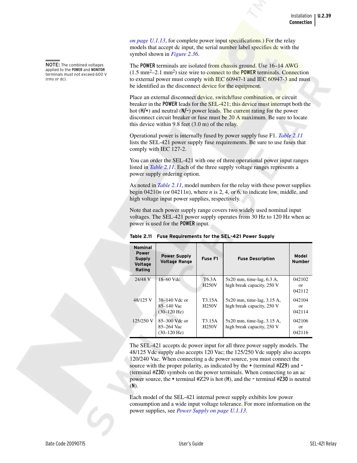 Table 2.11 Fuse Requirements for the SEL-421 Power Supply