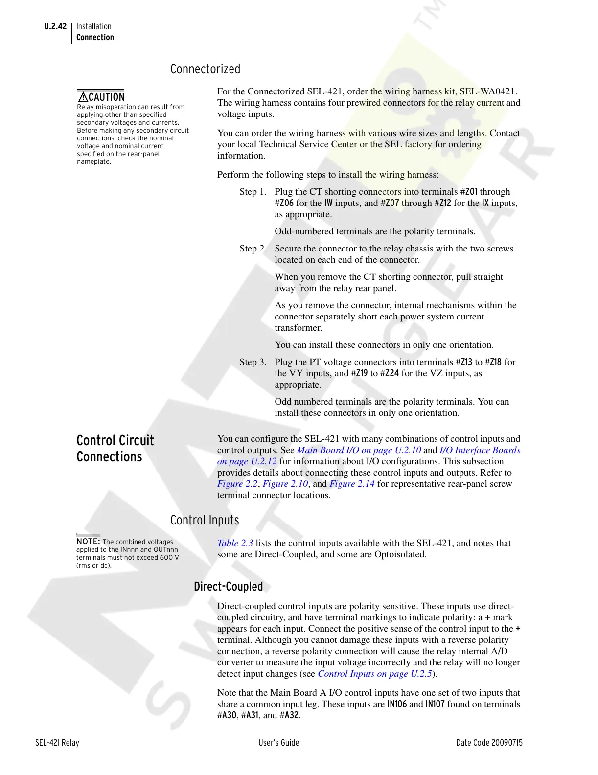 For the Connectorized SEL-421, order the wiring harness kit, SEL-WA0421.