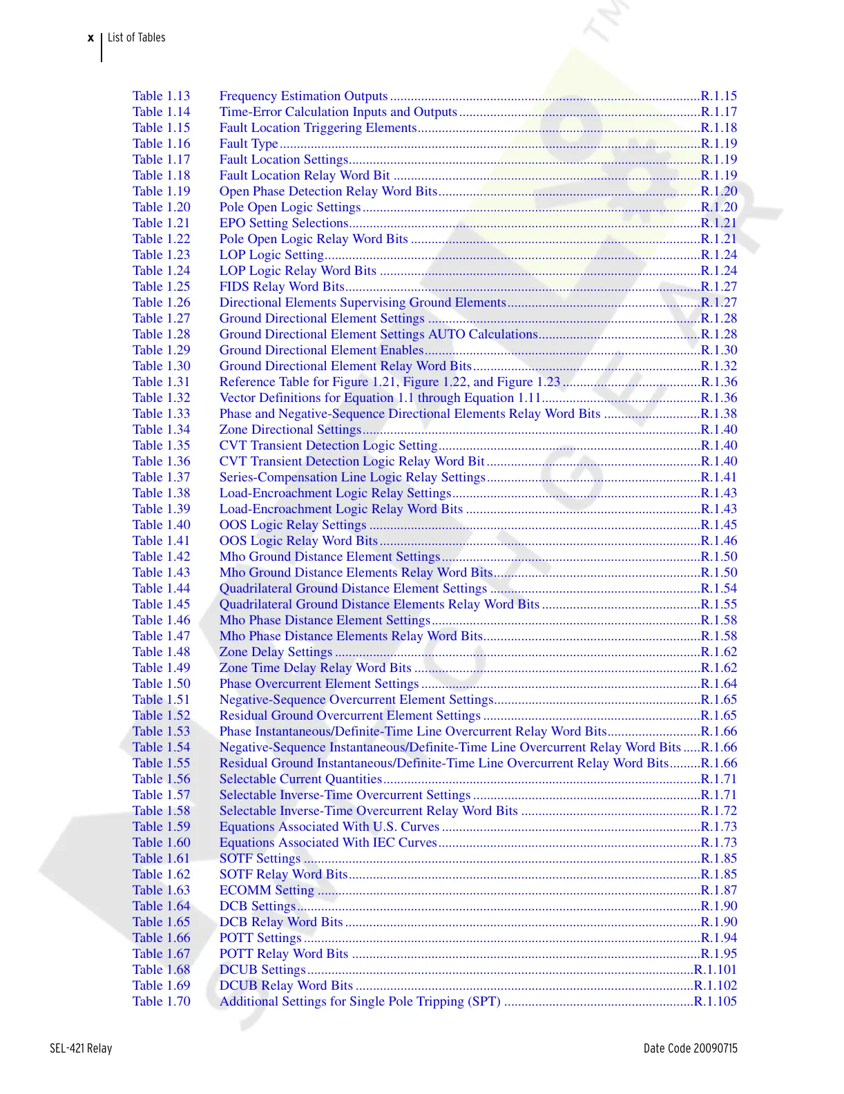 Table 1.53 Phase Instantaneous/Definite-Time Line Overcurrent Relay Word Bits...........................R.1.66