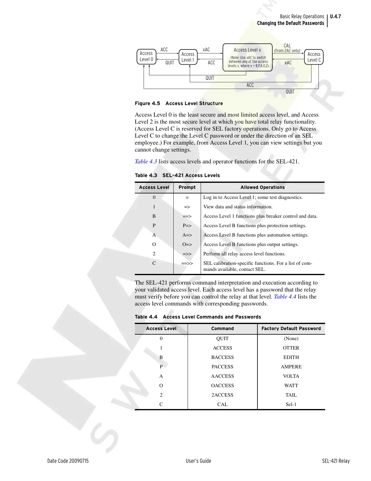 Table 4.3 lists access levels and operator functions for the SEL-421.