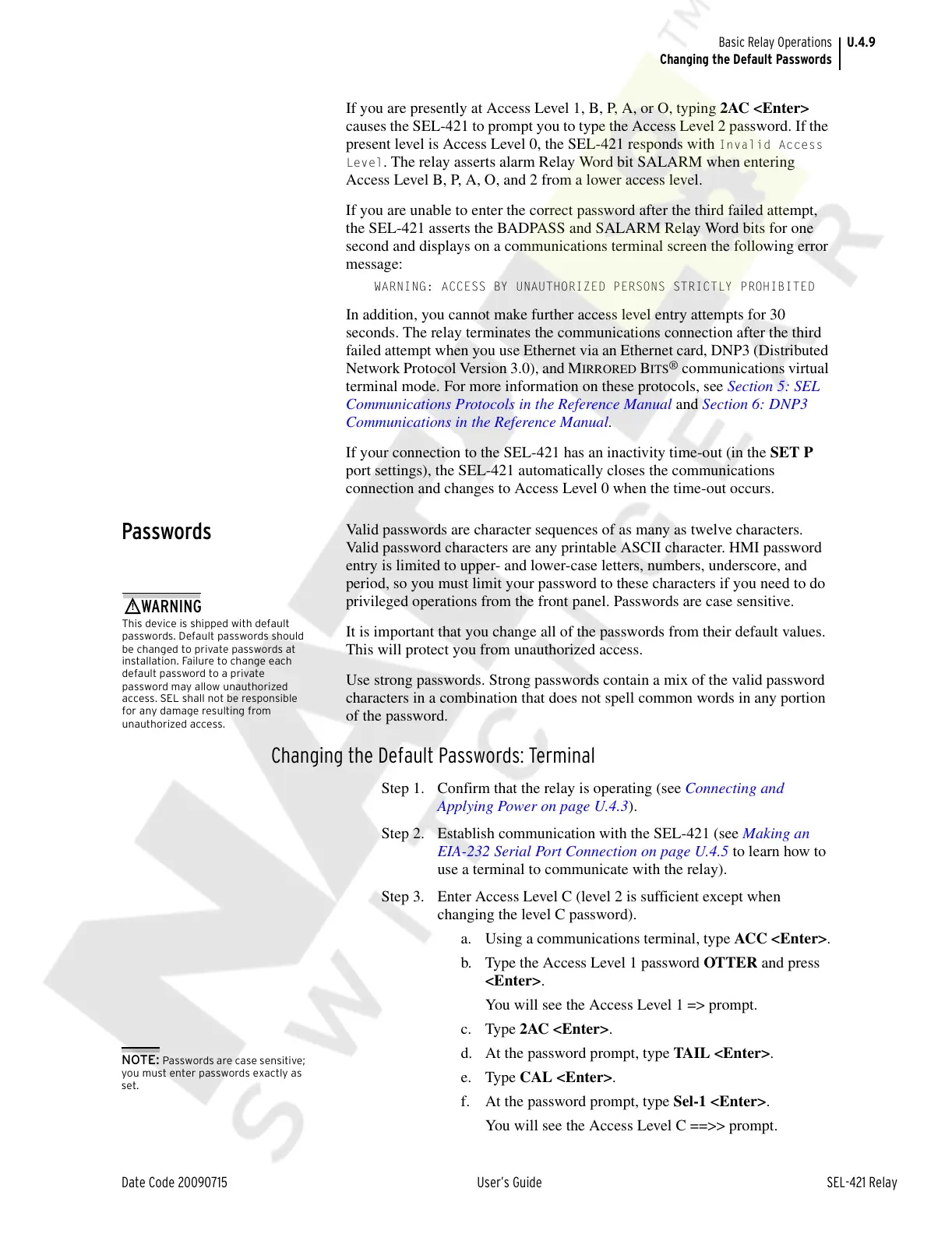 causes the SEL-421 to prompt you to type the Access Level 2 password. If the