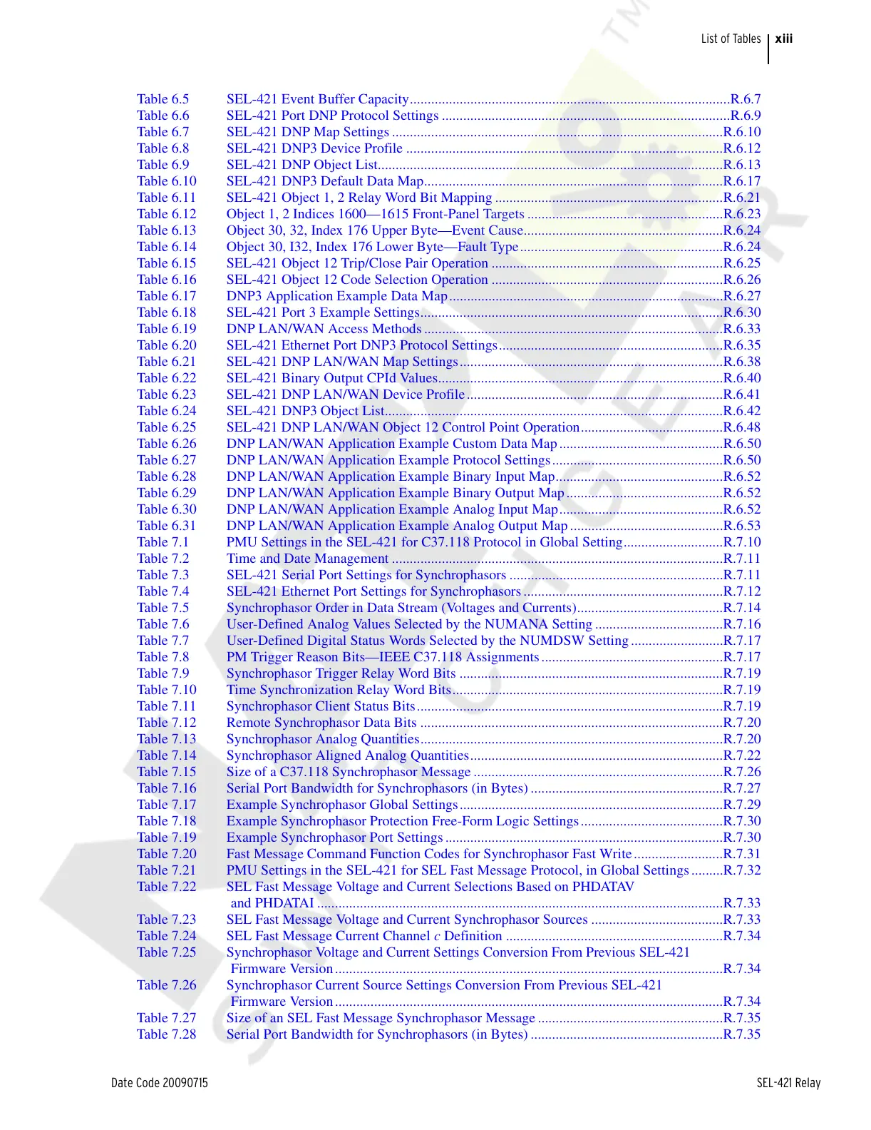 Table 6.9 SEL-421 DNP Object List.................................................................................................R.6.13