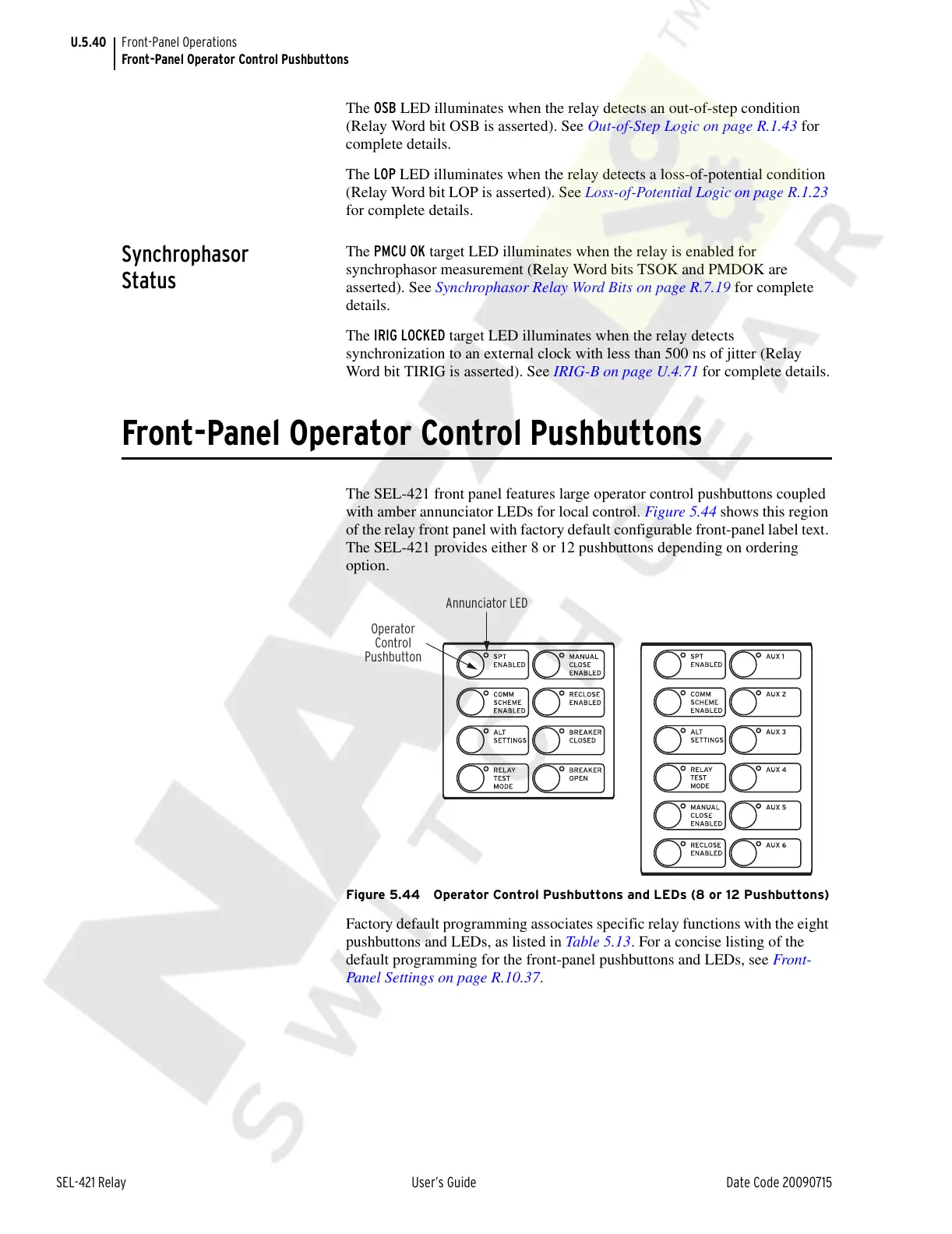 The SEL-421 front panel features large operator control pushbuttons coupled