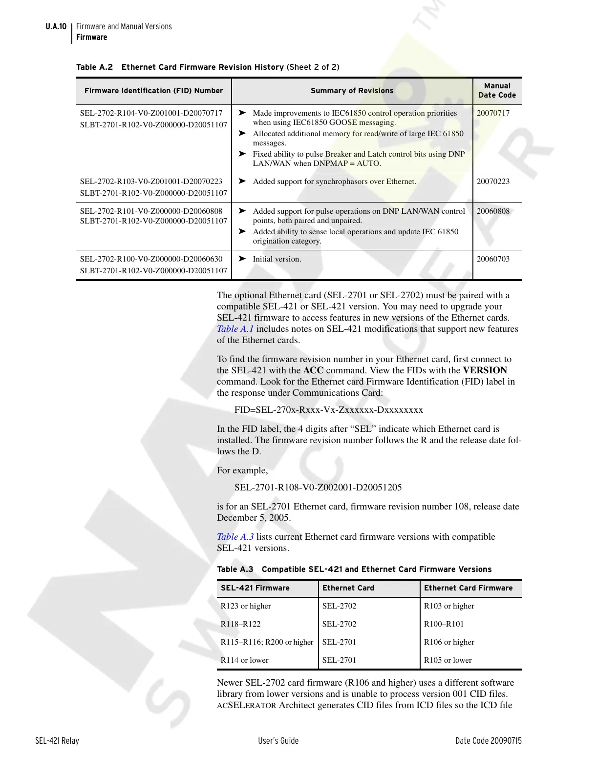 Table A.3 Compatible SEL-421 and Ethernet Card Firmware Versions