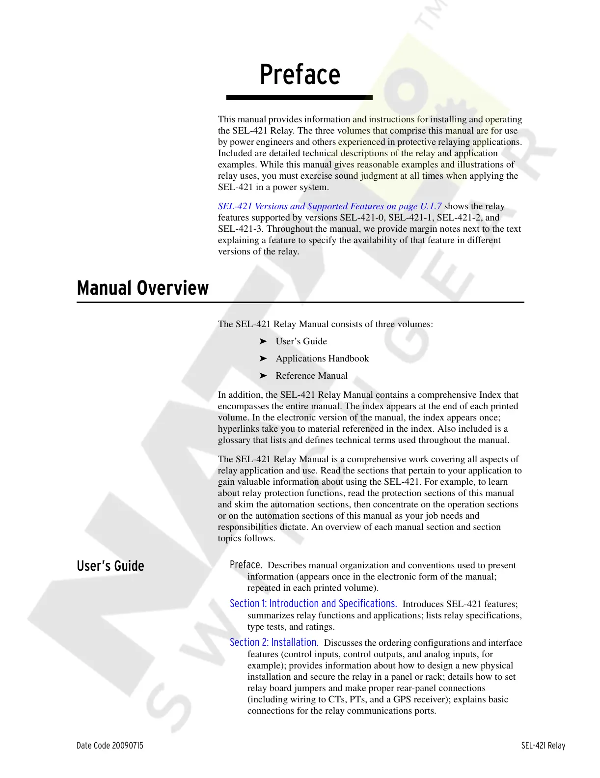 SEL-421-3. Throughout the manual, we provide margin notes next to the text