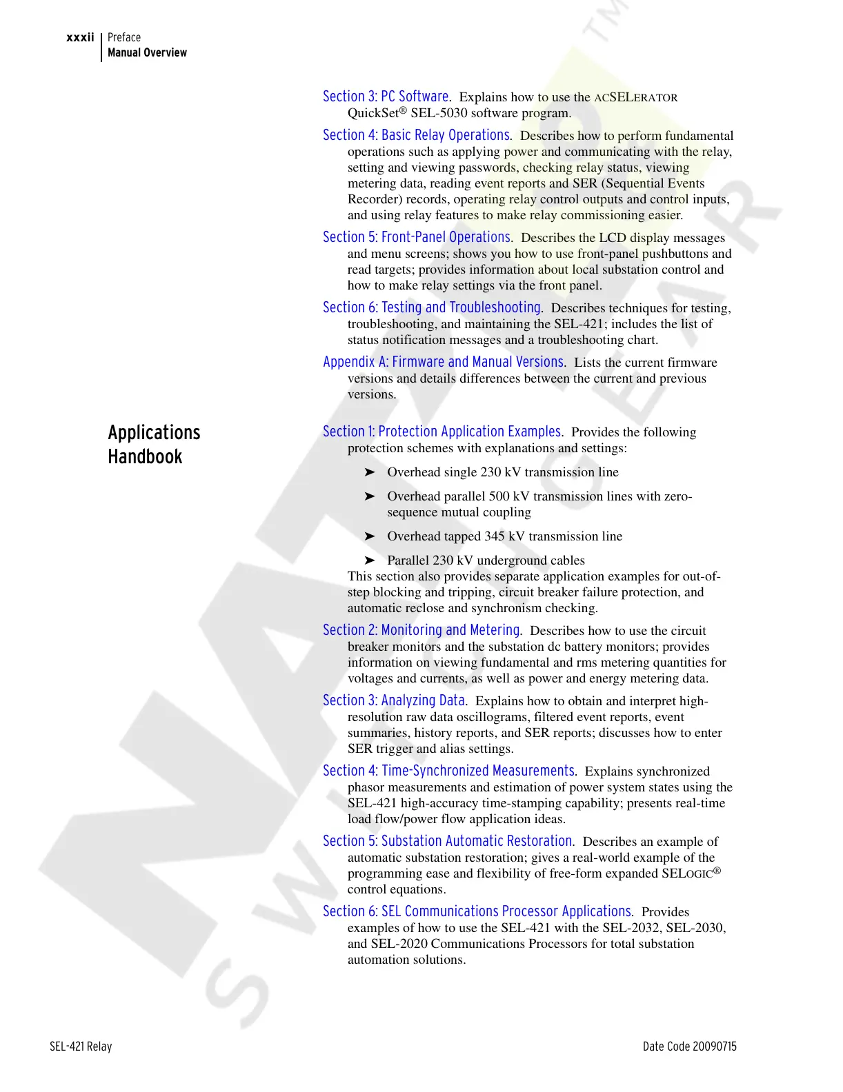 troubleshooting, and maintaining the SEL-421; includes the list of