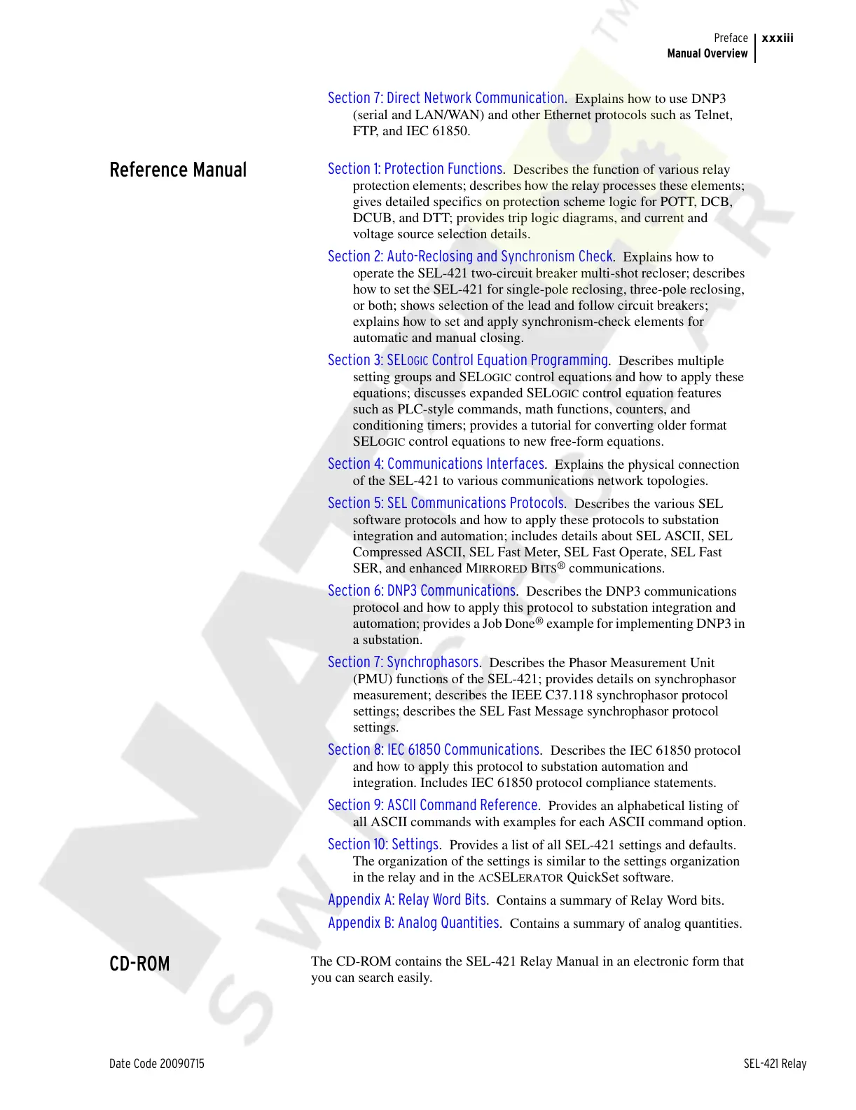 The CD-ROM contains the SEL-421 Relay Manual in an electronic form that