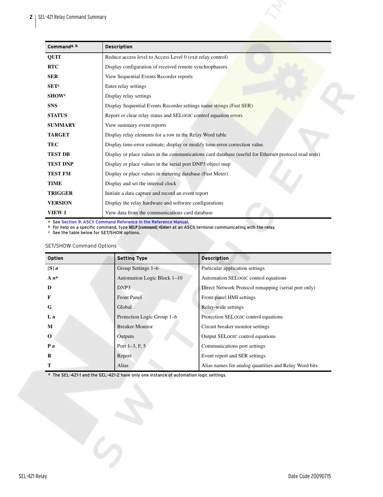 SEL-421 Relay Command Summary
