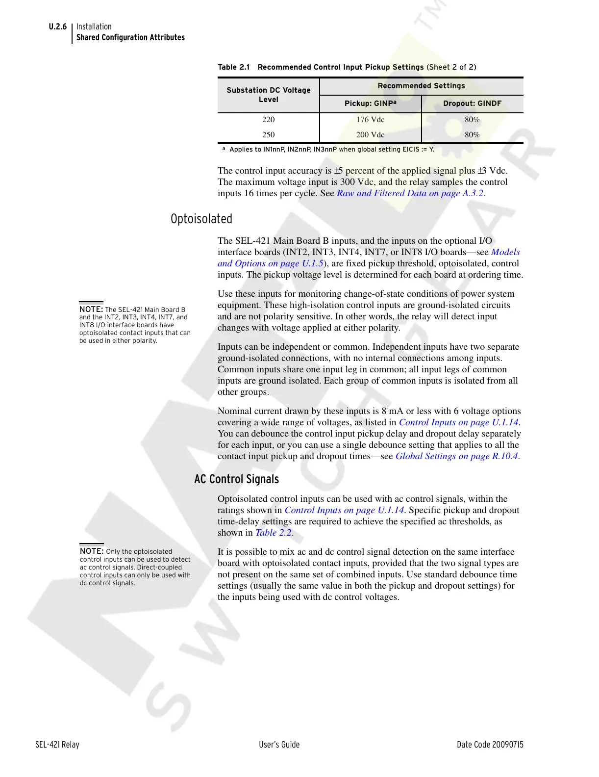 ratings shown in Control Inputs on page U.1.14. Specific pickup and dropout