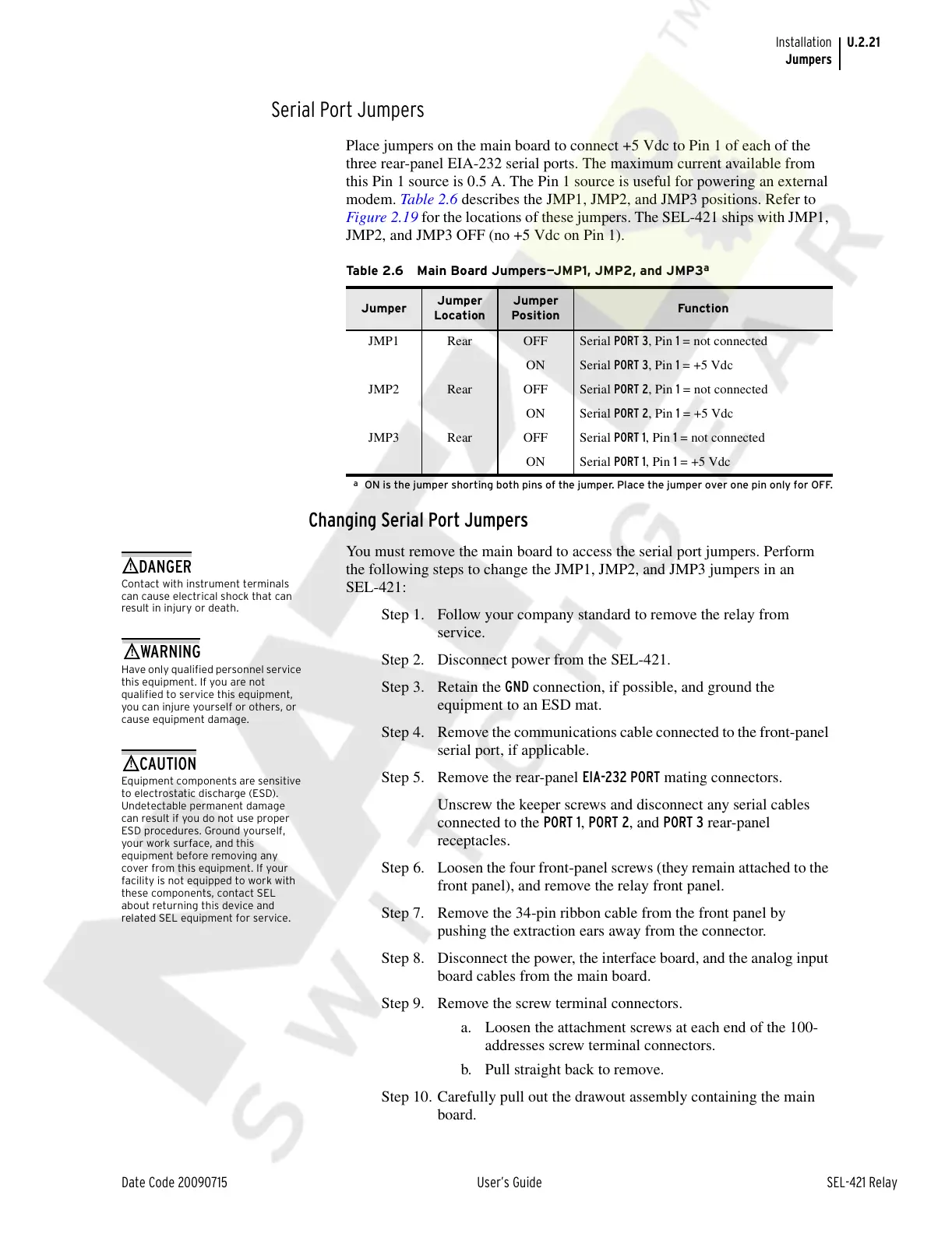Figure 2.19 for the locations of these jumpers. The SEL-421 ships with JMP1,