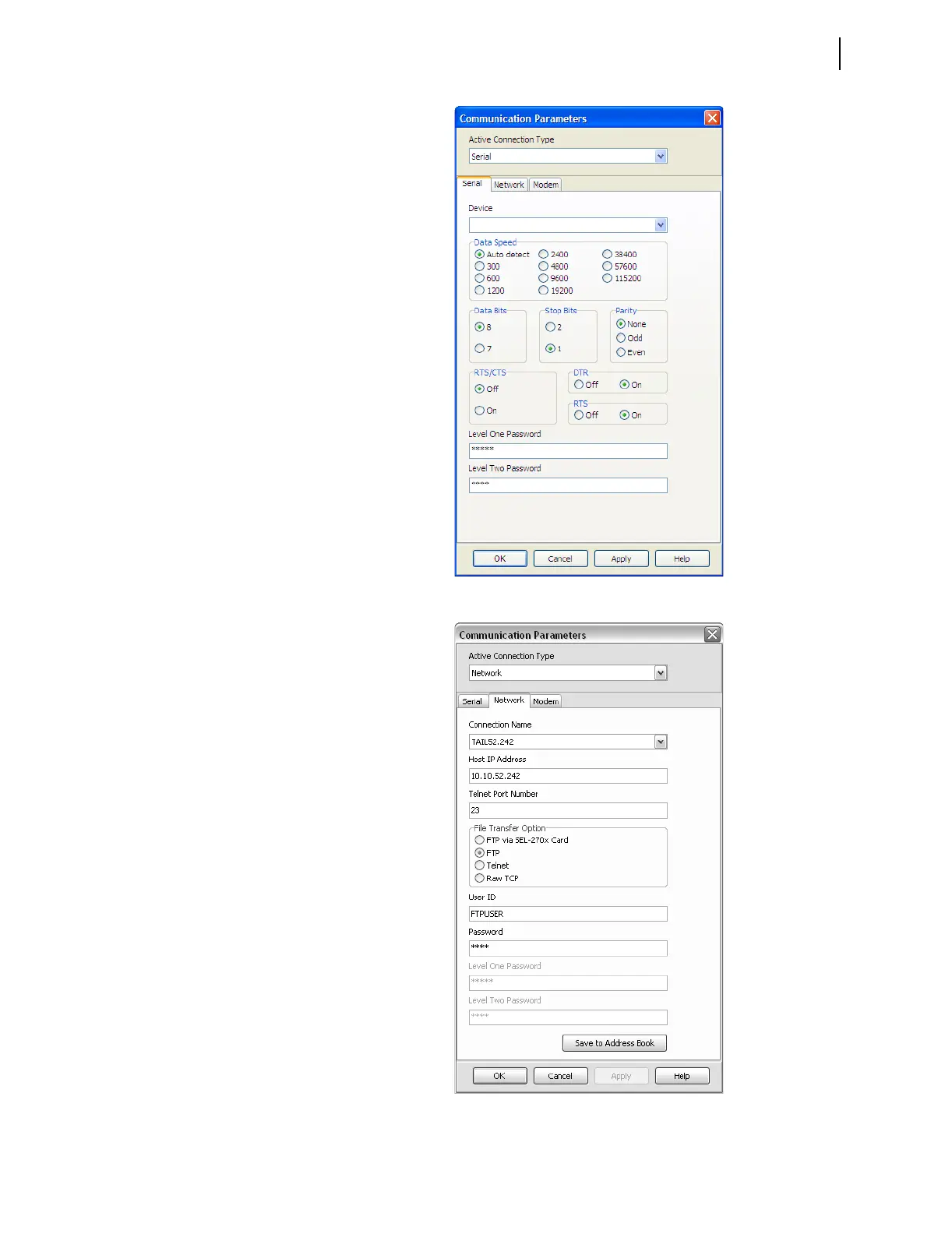 Sel 751A - Figure 3.2 Serial Port Communication Parameters Dialog Box; Figure 3.3 Network Communication Parameters Dialog Box