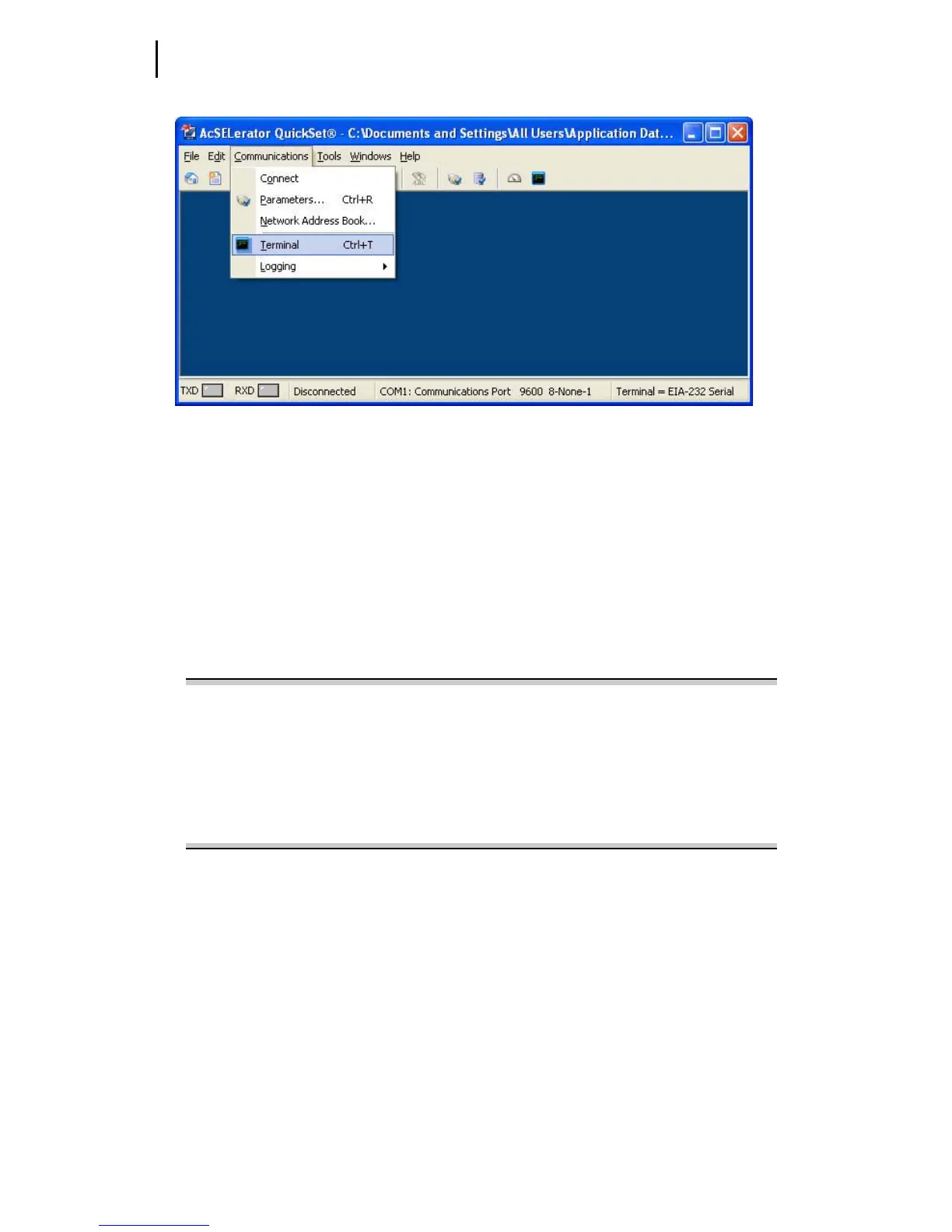emulation. Open the terminal window by clicking Communications > Terminal or by