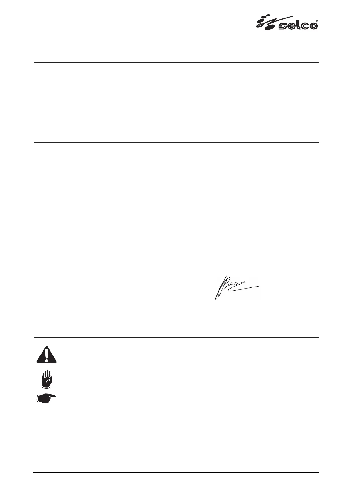 Det er brukerens ansvar å se til at håndboken ikke ødelegges eller forsvinner. SELCO s.r.l. forbeholder seg retten til å foreta