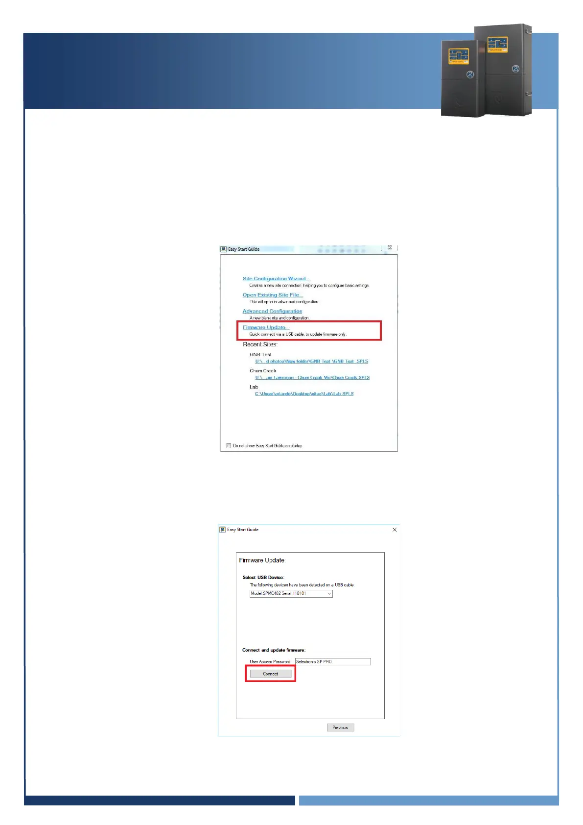 into the SP PRO and computer. Click “Connect” to start the Firmware Update process.