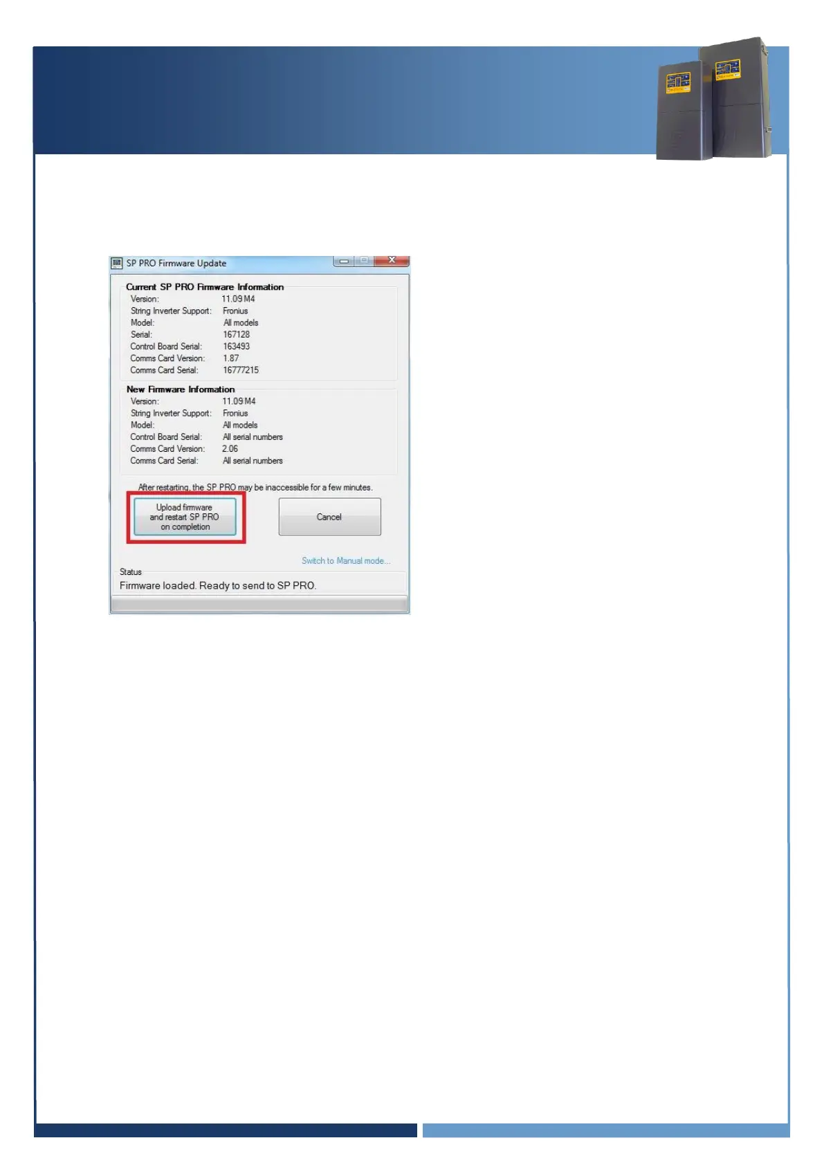 6. In the SP PRO Firmware update screen click on the Upload firmware and restart SP PRO on