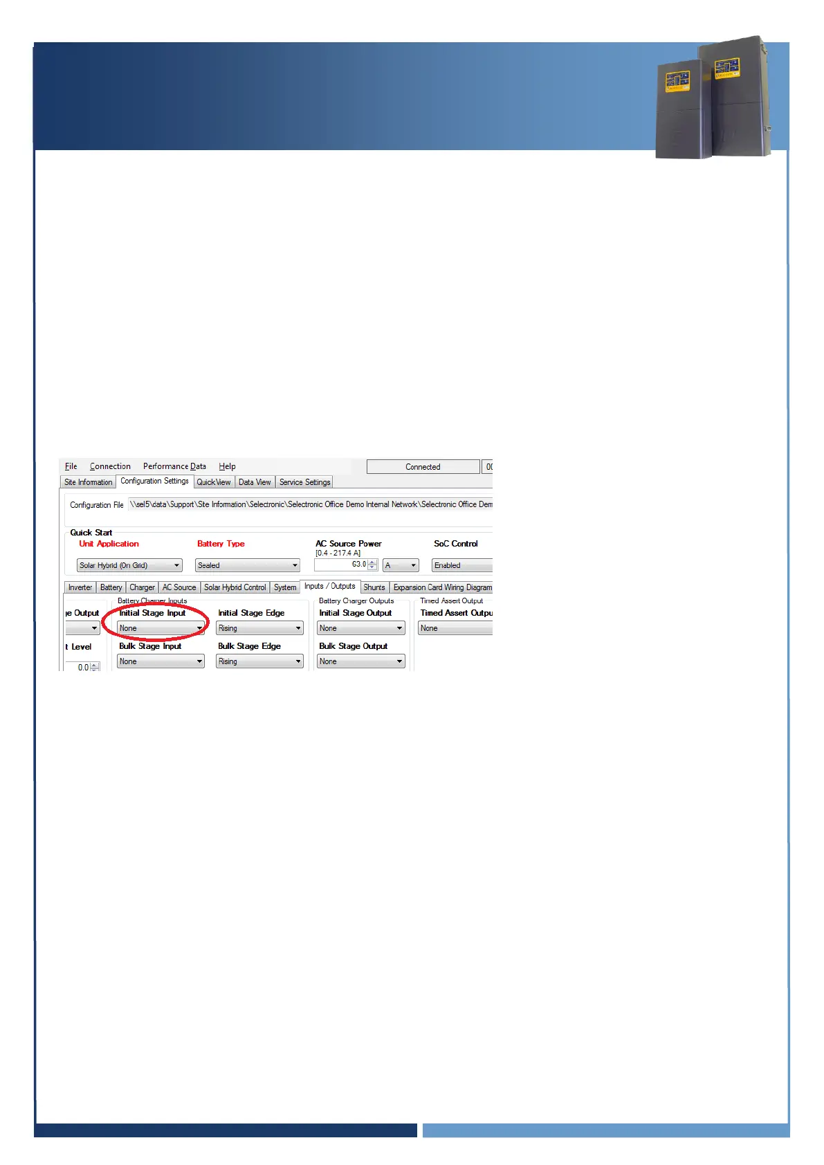 such as Configuration Settings >Inputs / Outputs > Battery Charger Inputs > Initial Stage Input