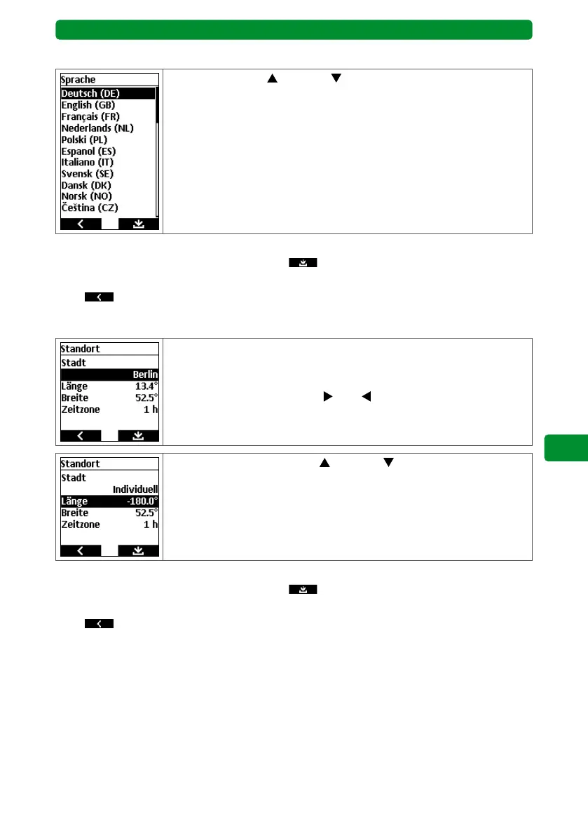 Mit den Fahrtasten (Auf) und (Ab) die gewünschte Landessprache
