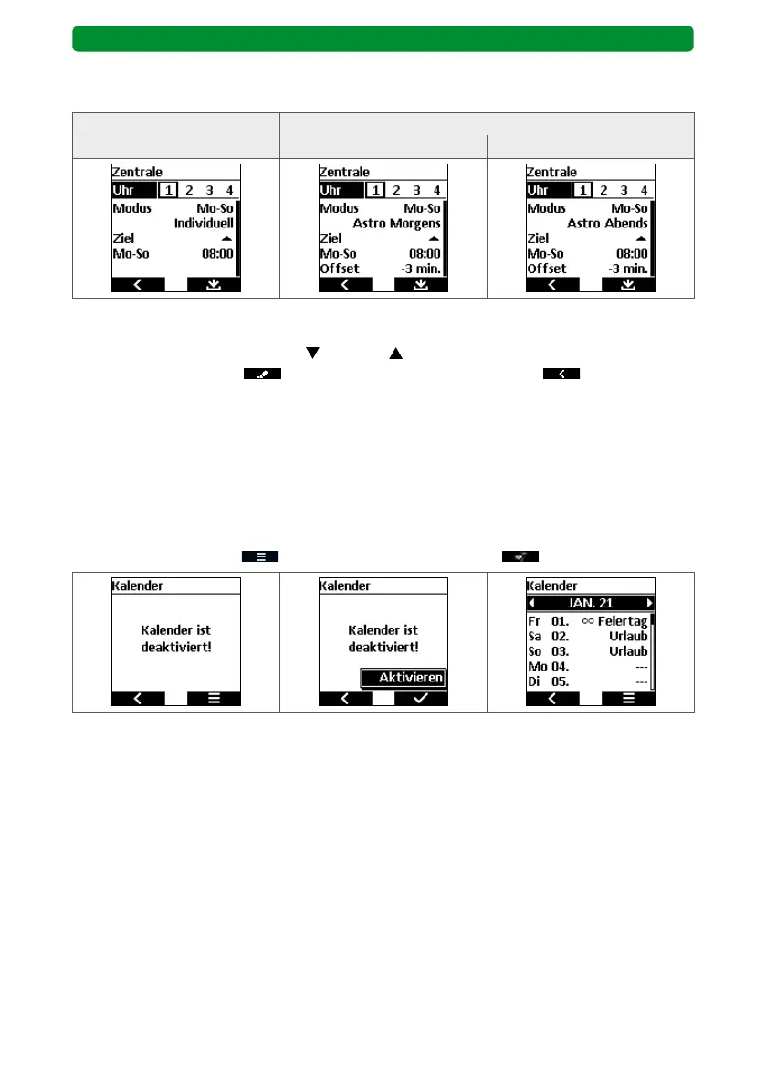 (Ab) oder (Auf) das Menü „Kalender“ wählen und mit