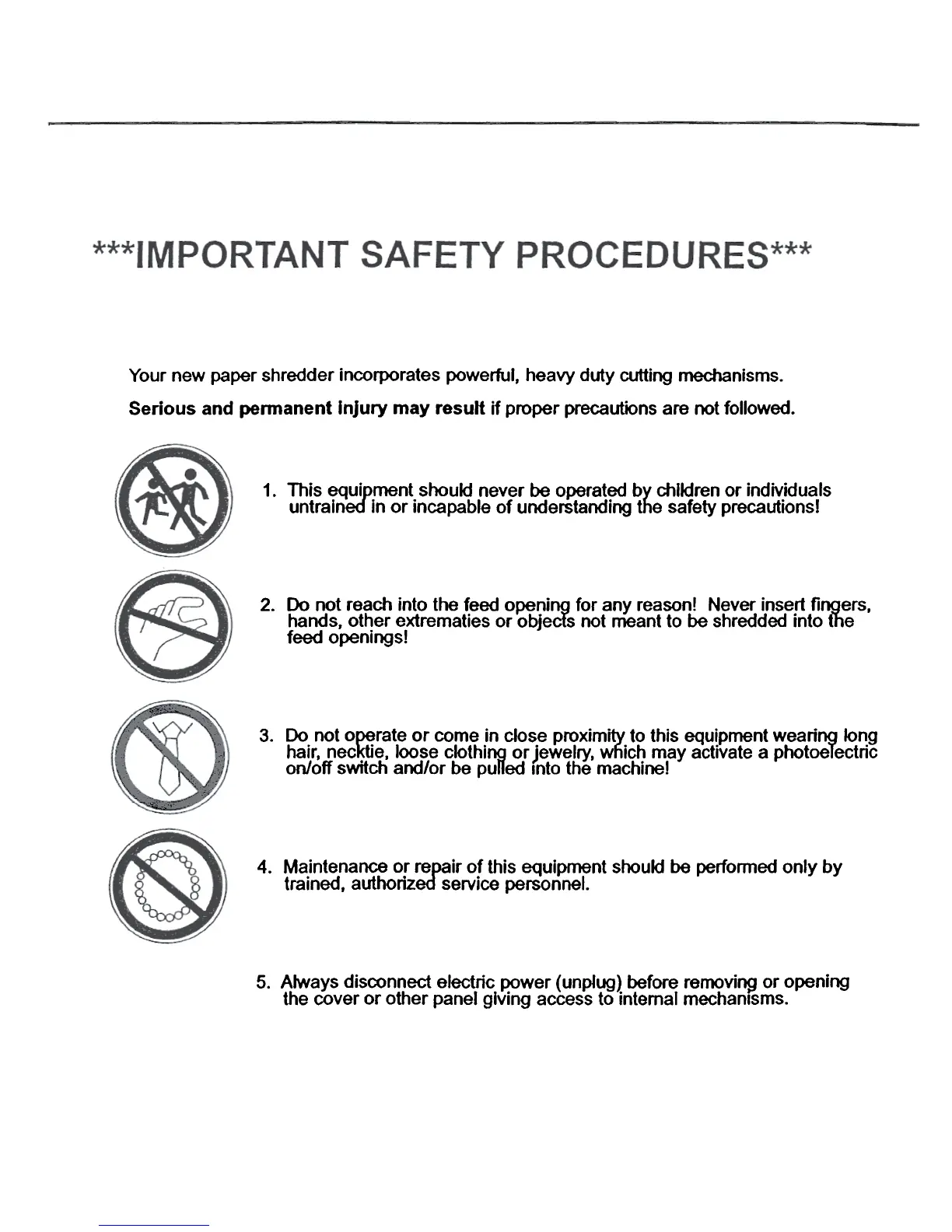 2. Do not reach into the feed o~ning for any reason! Never insert fingers,