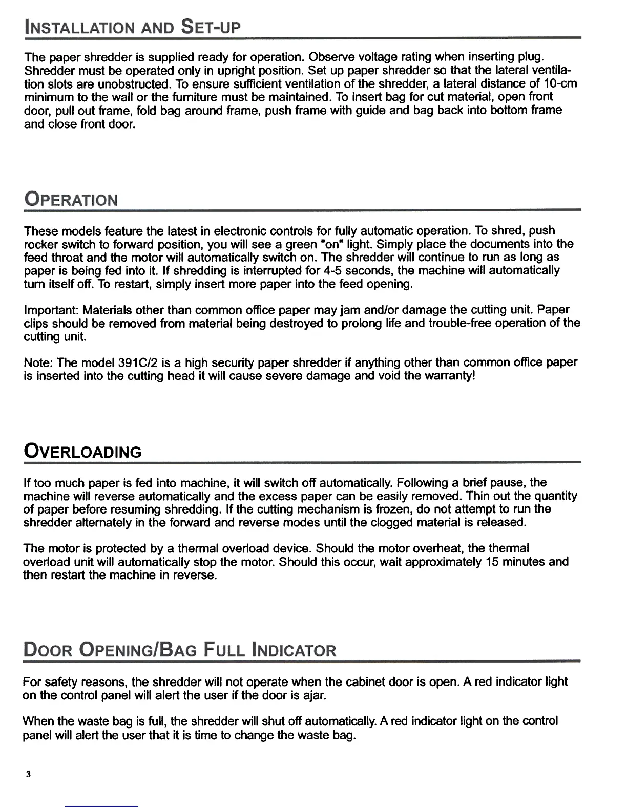 Note: The model 391 C/2 is a high security paper shredder if anything other than common office paper
