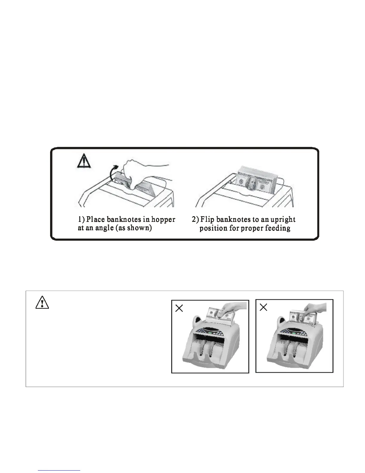 For proper operation, it is important that the banknotes be placed in the hopper as illustrated in the following
