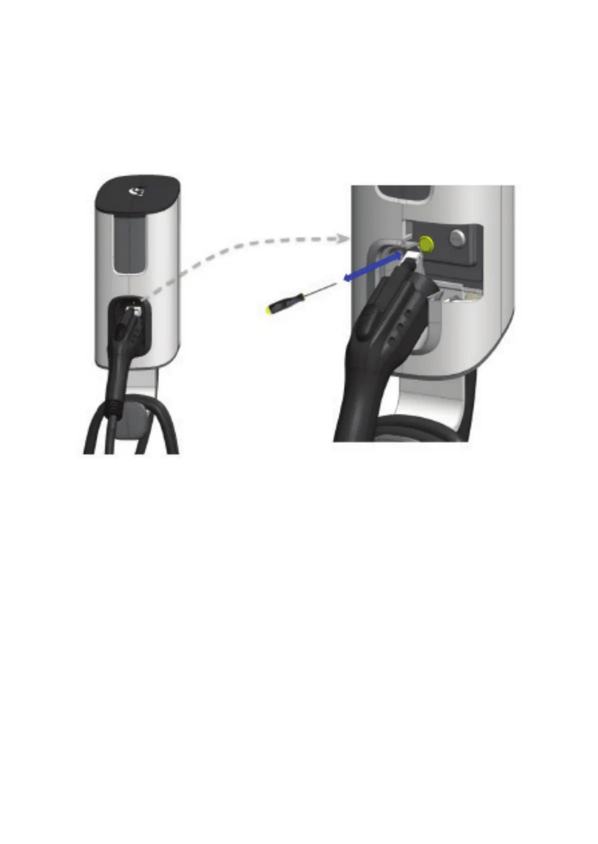 where the vehicle connector attaches to the charger and briey pressing the recessed button for less