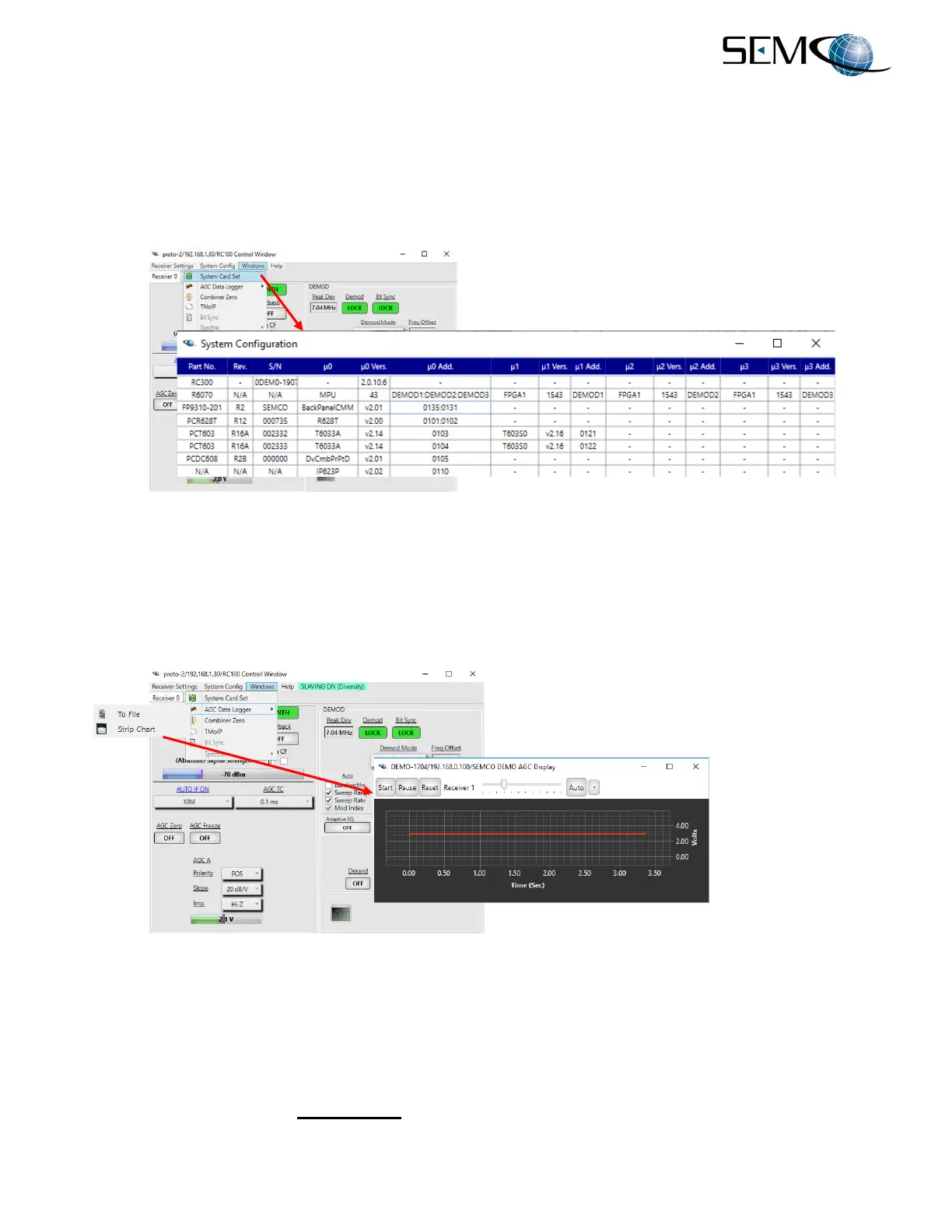 Windows settings include System Card Set, AGC Data Logger, Combiner Zero, TM over IP, Receiver