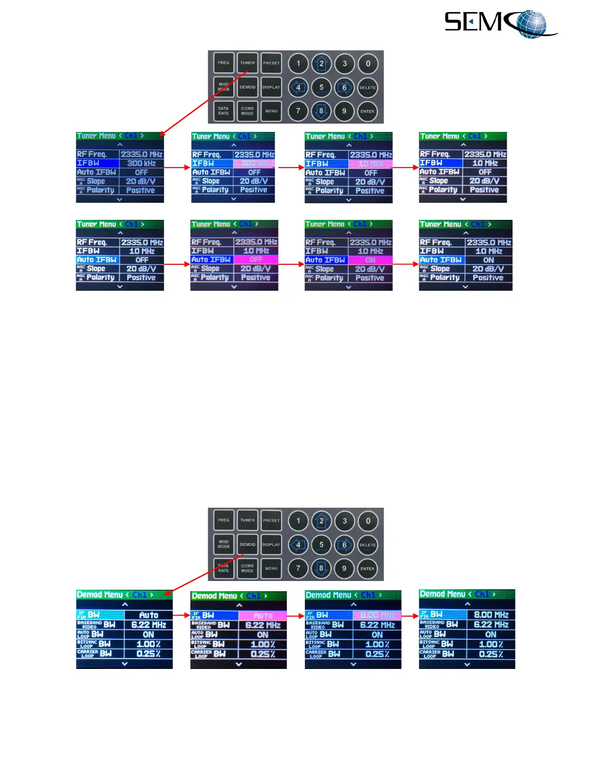 (2) and DOWN (8) arrows to scroll to IF FIR BW in blue, and then pushes ENTER or SELECT (5) to