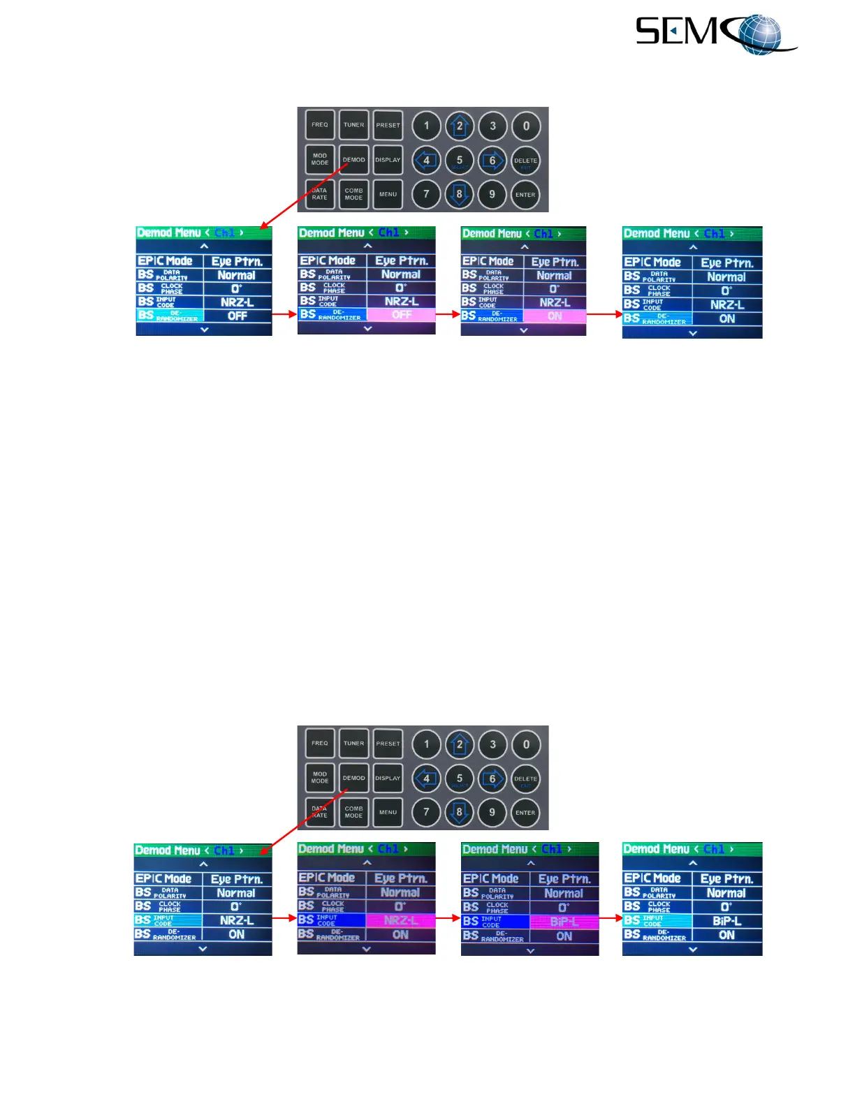 The operator pushes the DEMOD MODE button to access the <Ch1> Demod Menu display, uses the UP