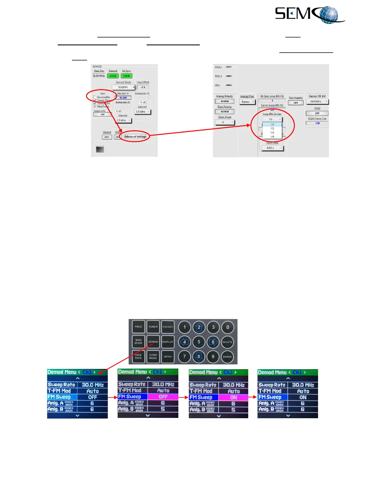 The operator pushes the DEMOD button to enable the <Ch1> Demod Menu display, uses the UP (2) and