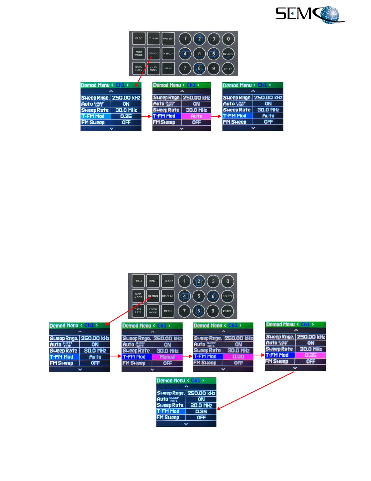 The operator pushes the DEMOD button to enable the <Ch1> Demod Menu, uses the UP (2) and DOWN