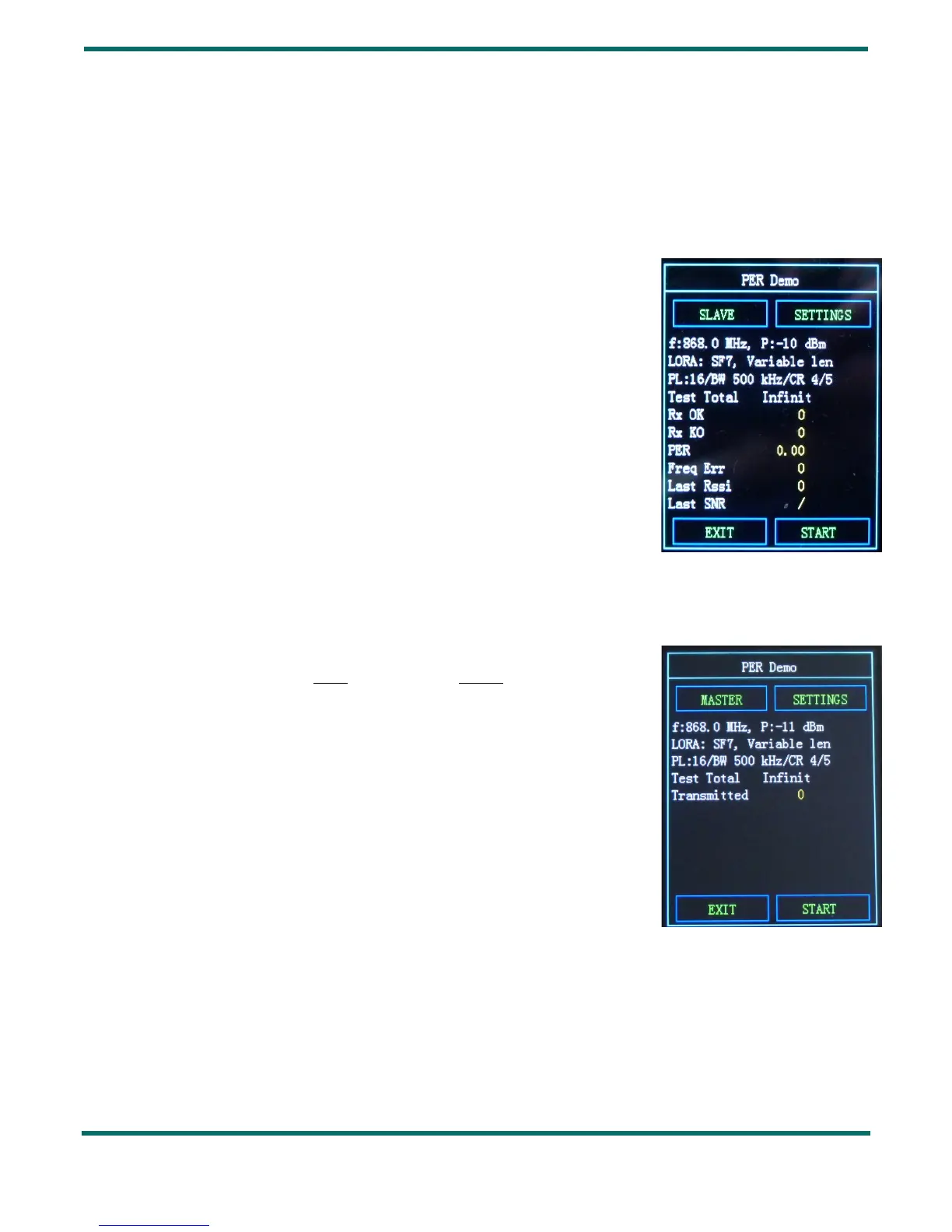 (Slave). Given that this is a unidirectional test, the packet error rate is not displayed on the transmitter (Master).