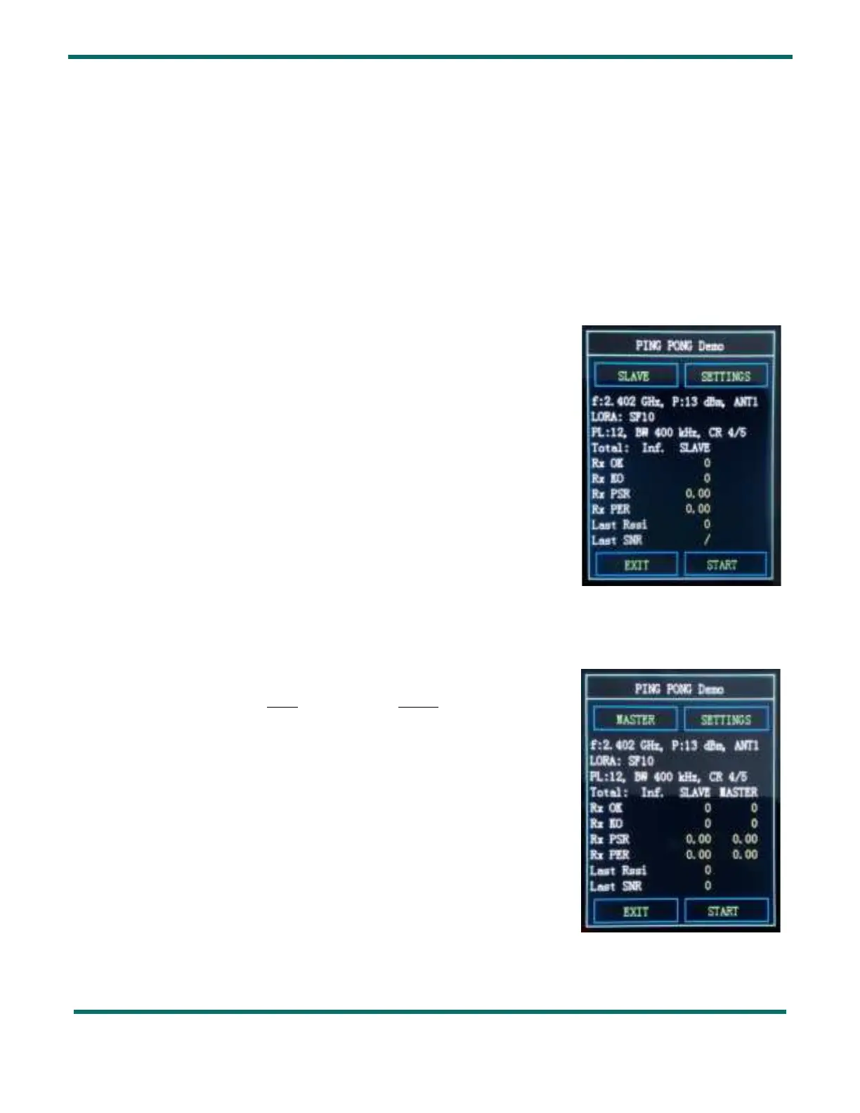 A Ping Pong Test is a bidirectional test between a pair of SX1280 kits. One needs to be configured as the Ping Pong