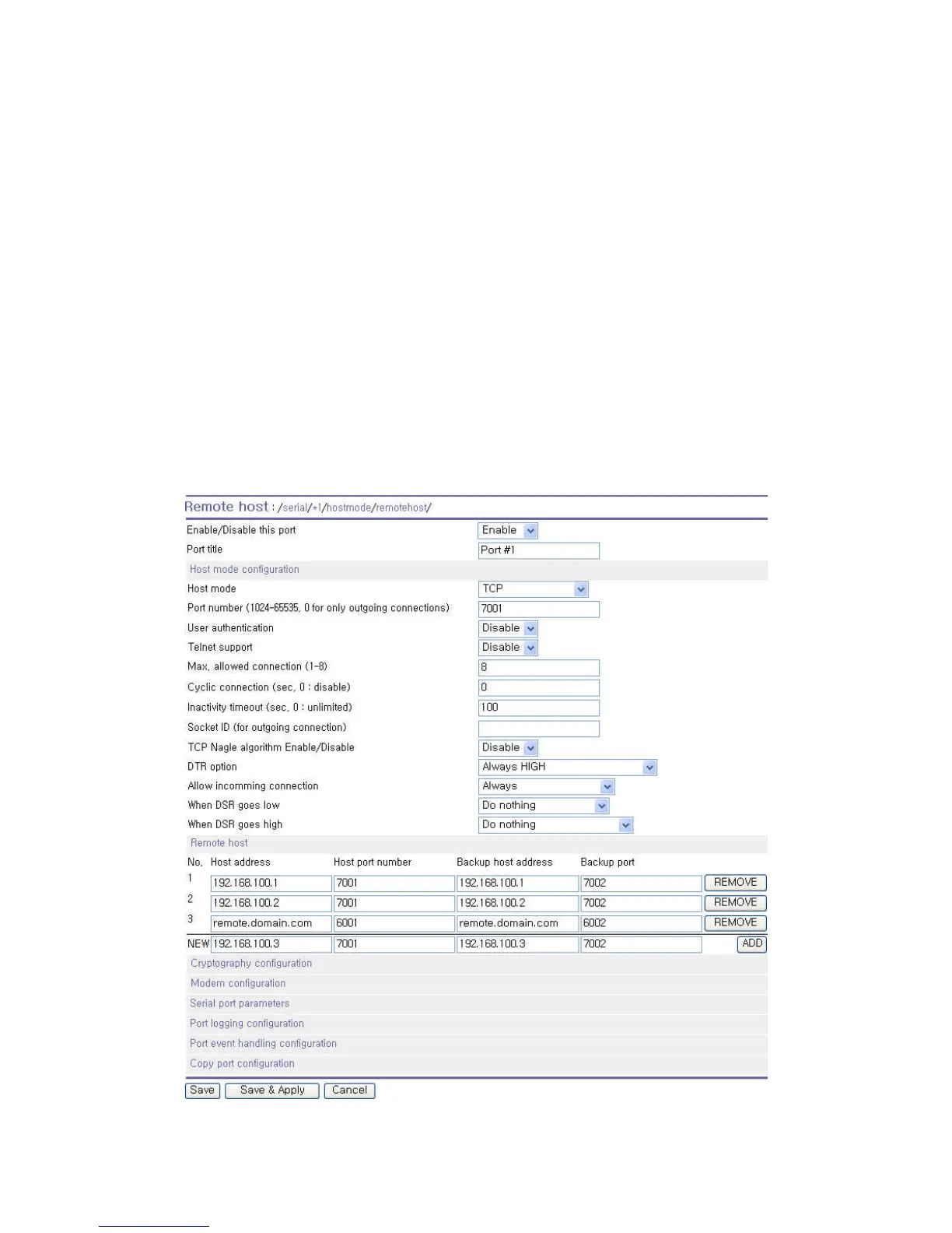 Remote host configuration is the list of hosts that will receive data from serial port of Pro Series when