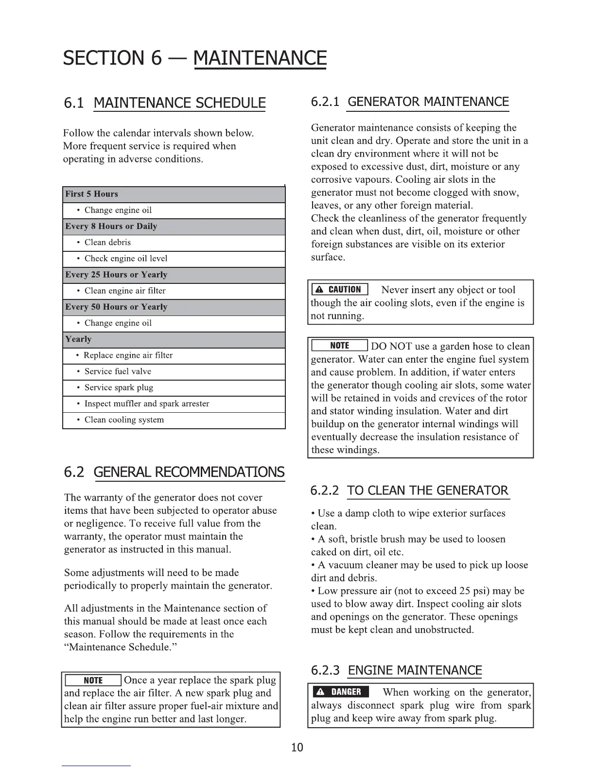 Senci SC10000E - Maintenance; Maintenance Schedule; Engine Maintenance Overview