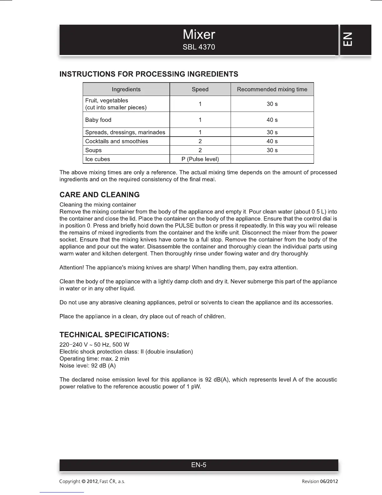 Sencor SBL 4370 - Instructions for Processing Ingredients; Care and Cleaning; Technical Specifications