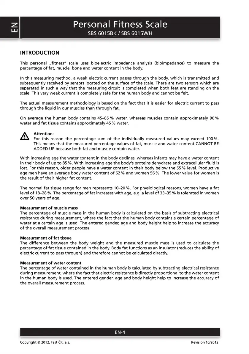 Sencor SBS 6015BK - Introduction to Bioimpedance Analysis; Measurement of Muscle Mass; Measurement of Fat Tissue; Measurement of Water Content