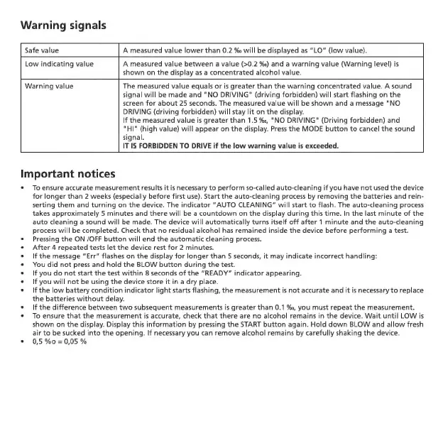 Sencor SCA BA02 - Warning Signals; Important Notices